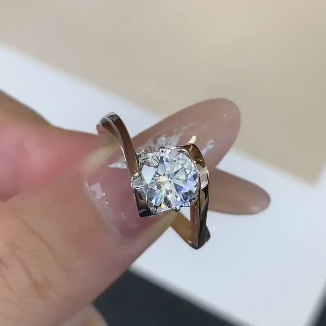 This 1.60tcw lab-grown diamond ring features a 1.50ct round center and 0.10ct accents in a modern bypass band. IGI certified, D–F color, VVS–VS clarity, and handcrafted in two-tone yellow and white gold—elegant, ethical, and unique.
