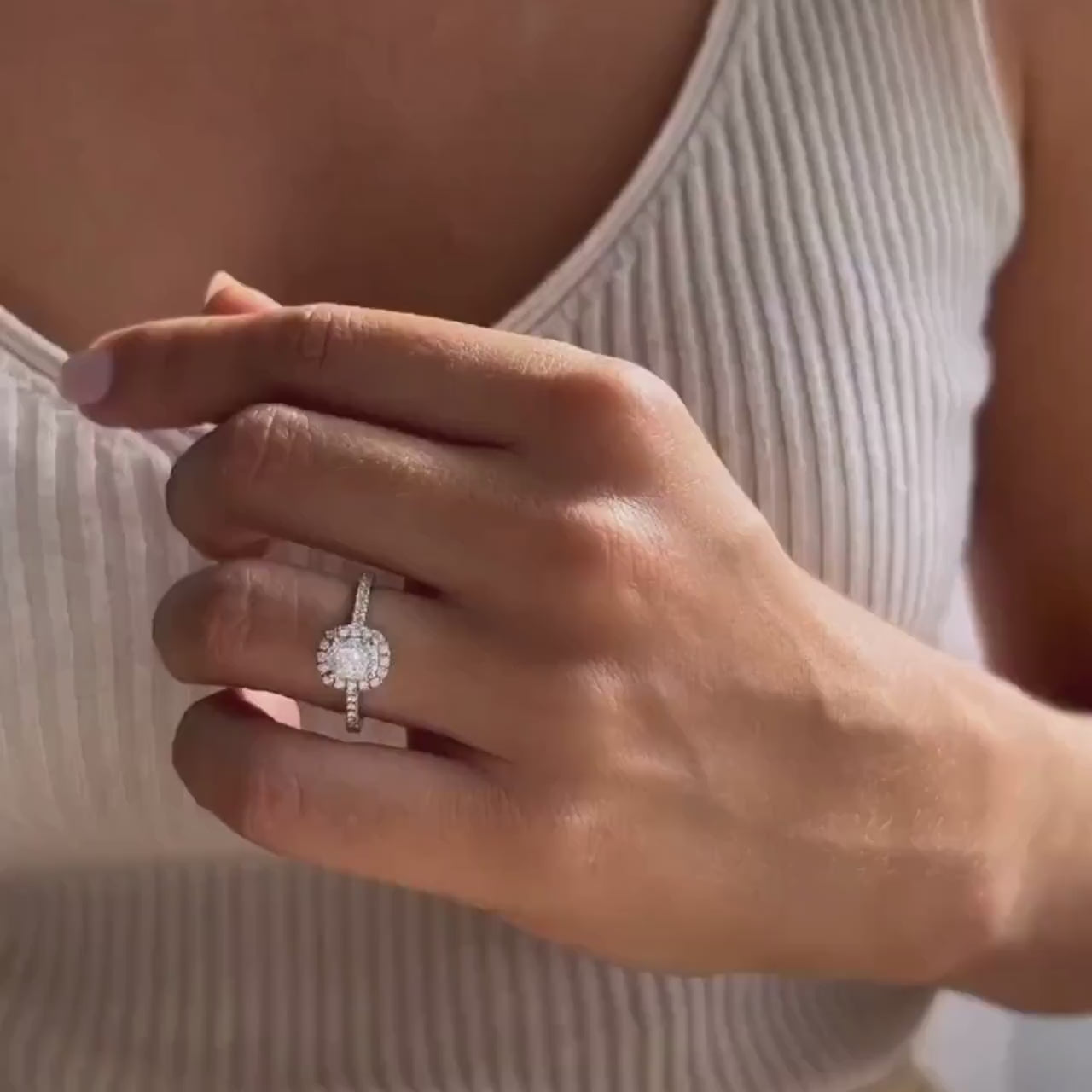 5Celebrate elegance with this 1.50tcw Cushion Lab-Grown Diamond Engagement Ring, featuring a 1.00ct cushion-cut center and 0.50ct of round halo and side stones. IGI certified, D-E-F color, VVS–VS clarity. Set in a cathedral-style design, customizable in gold or platinum.