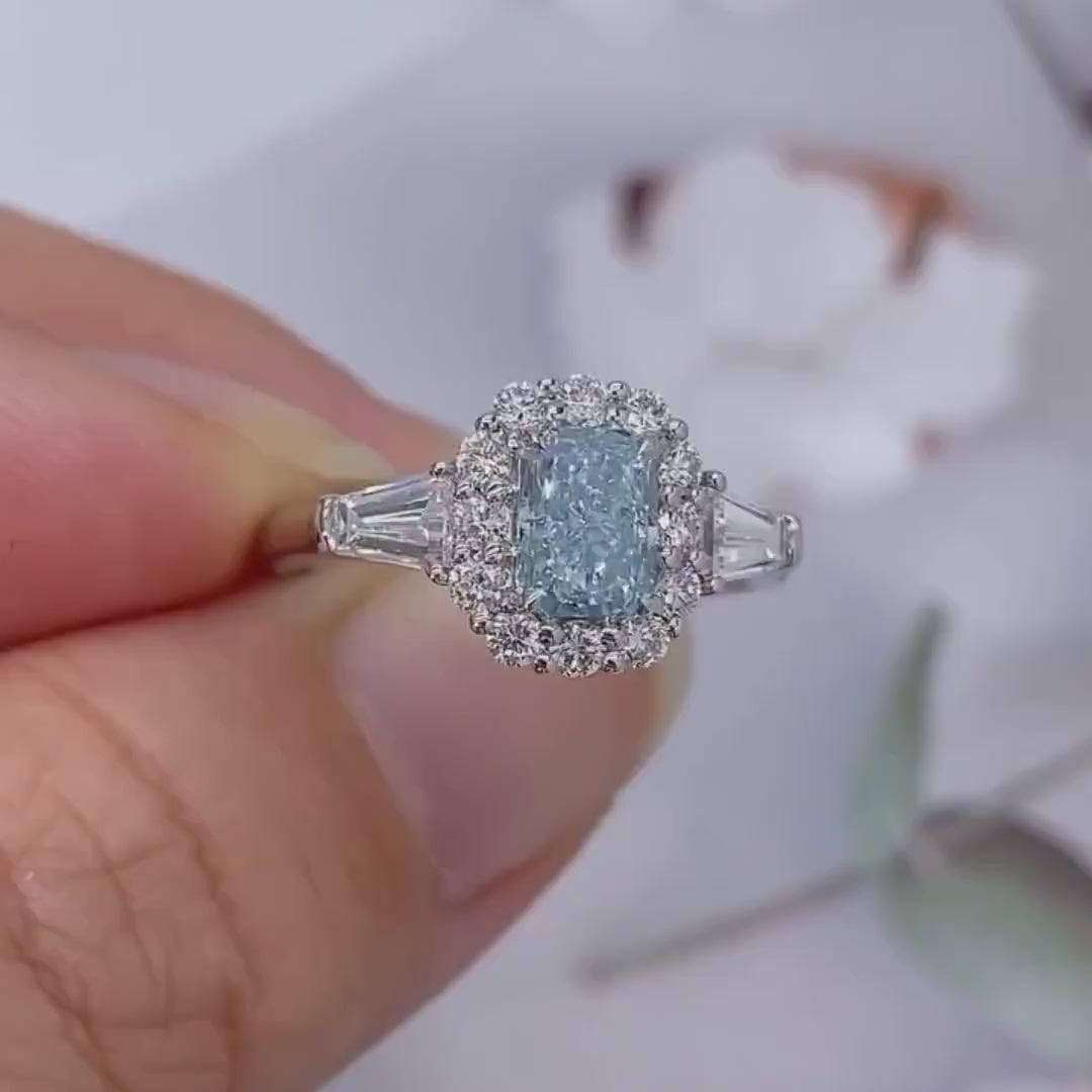 1.75tcw Radiant Fancy Blue Diamond Ring | Lab-Grown | Halo Three Stone | VVS-VS Clarity