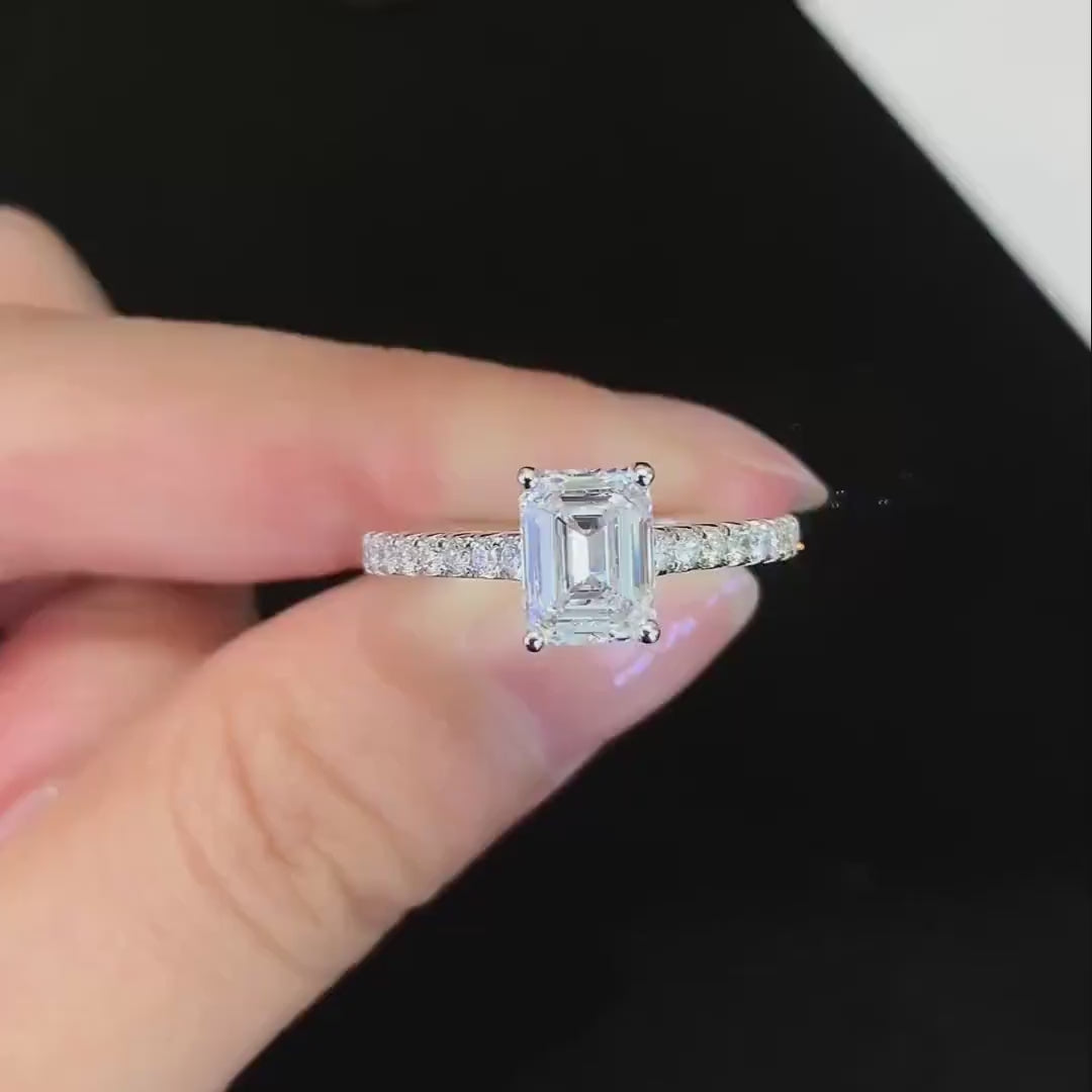 This 1.80tcw Emerald Cut Lab Grown Diamond Engagement Ring features a 1.50ct center stone and 0.30ct round pavé accents. Crafted in white gold with IGI-certified DEF color, VVS–VS clarity diamonds, it’s the perfect blend of elegance and sustainability.