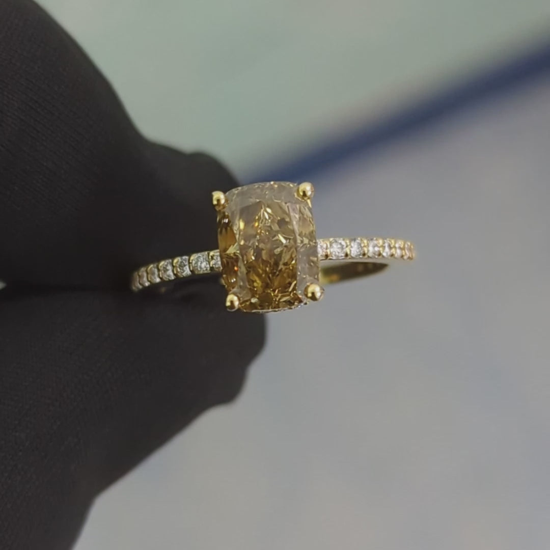 1.85tcw Fancy Cushion Lab-Grown Diamond Ring with a hidden halo. Features a 1.50ct Fancy Yellow center stone in VVS–VS clarity with 0.35ct round accents. IGI certified and handmade in 10k/14k/18k gold. Ships in 5–7 days from India. Elegant, ethical, and customizable.