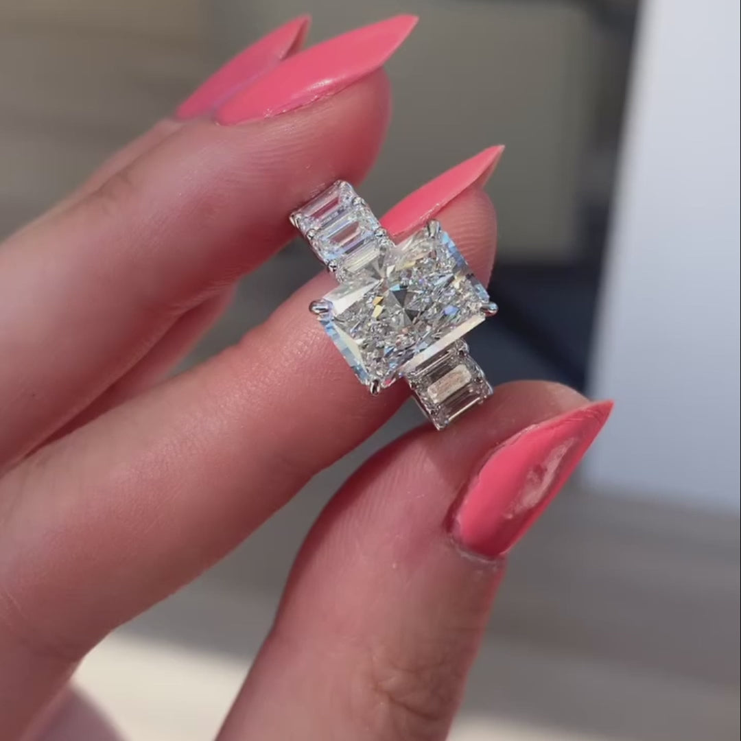 This 11.30tcw Radiant Lab-Grown Diamond Engagement Ring features a 5.00ct radiant-cut center stone paired with 6.30ct emerald-cut side stones. IGI certified, DEF color, VVS–VS clarity, and handcrafted in 10k/14k/18k gold—this ring is a bold, luxurious statement of everlasting love.