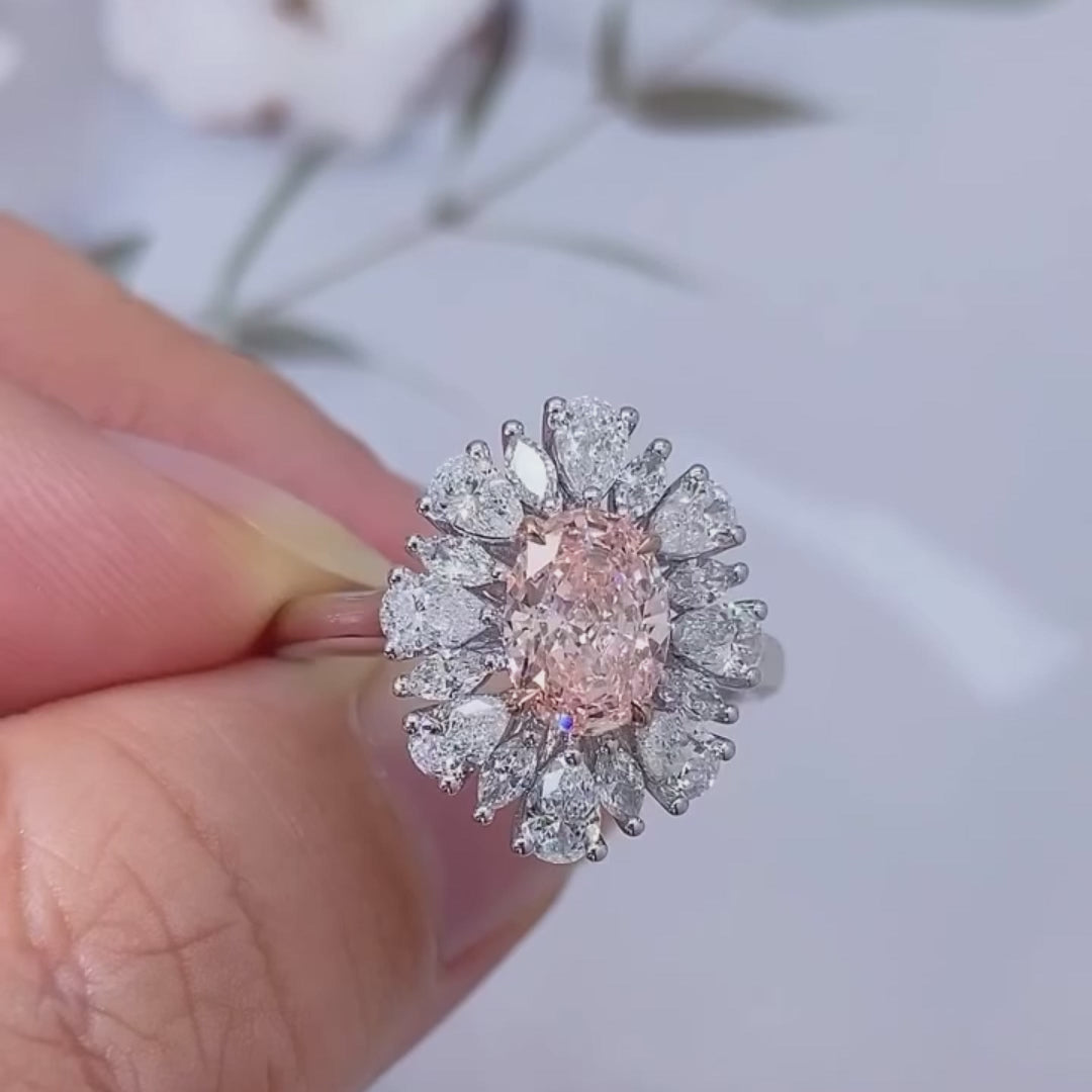 2.50tcw Oval Fancy Pink Lab Grown Diamond Halo Engagement Ring | Pear & Marquise Side Stones | VVS–VS Clarity | IGI Certified | 14k/18k Gold