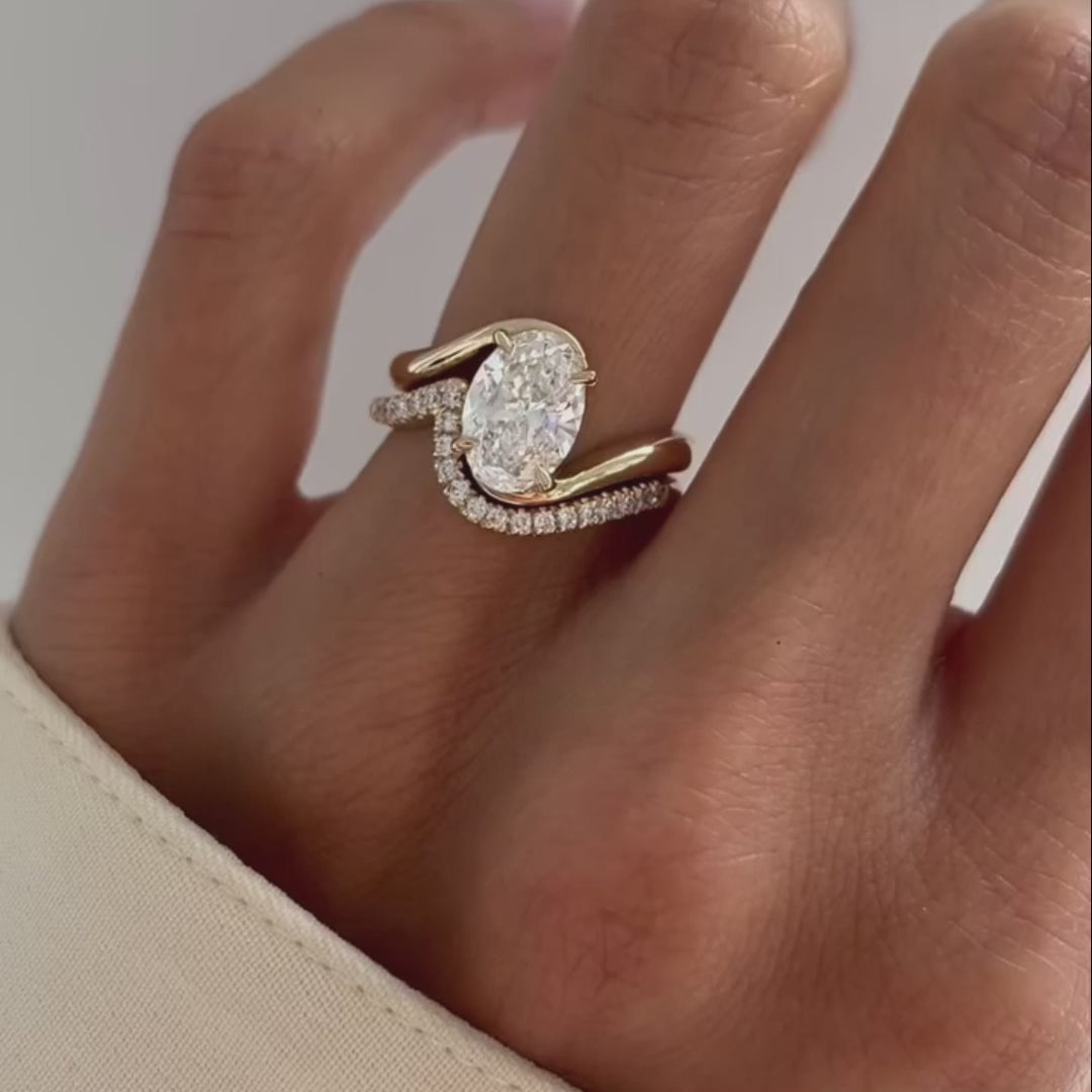This 2.50tcw oval lab-grown diamond bypass engagement ring features a striking 2.00ct center stone complemented by a matching 0.50ct pavé band. IGI certified, D–E–F color, VVS–VS clarity, and handcrafted in your choice of 10k, 14k, or 18k gold — a modern, elegant, and ethical statement.