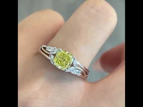 3.00ct Fancy Yellow Cushion Cut Diamond Ring | 0.30ct Side Stones | 14K White Gold | Unique Split Shank Engagement Ring