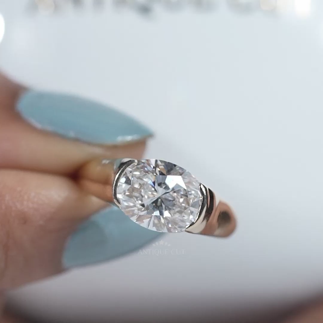 This breathtaking 3.00ct Oval Bezel Set Ring combines contemporary sculptural design with timeless elegance. The large, brilliant oval stone is securely wrapped in a smooth, polished bezel setting that enhances the stone’s shape while providing maximum protection and everyday comfort.