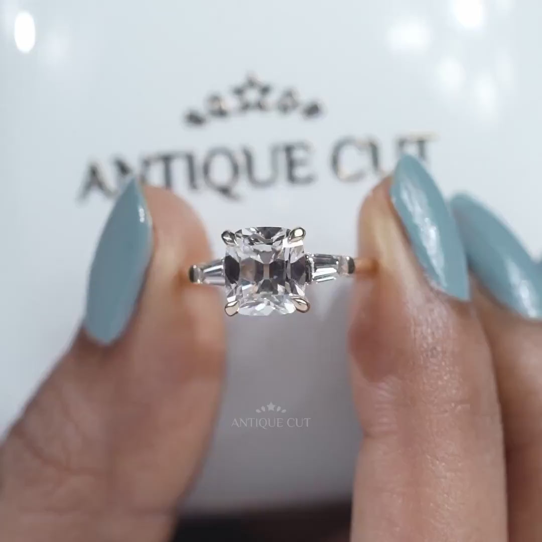 3.10tcw Cushion-Cut Lab Diamond Ring | Tapered Baguette Side Stones | Elegant Gold Engagement Ring