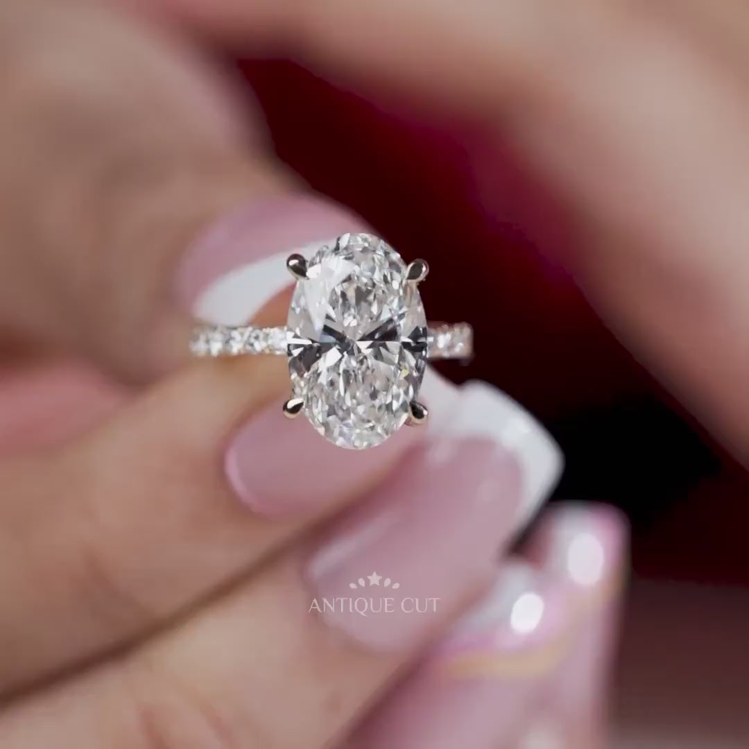 3.15ct Oval Cut Diamond Engagement Ring | 2.50ct Oval Center with Hidden Halo | Pave Band Diamond Ring