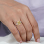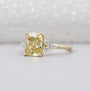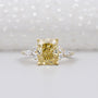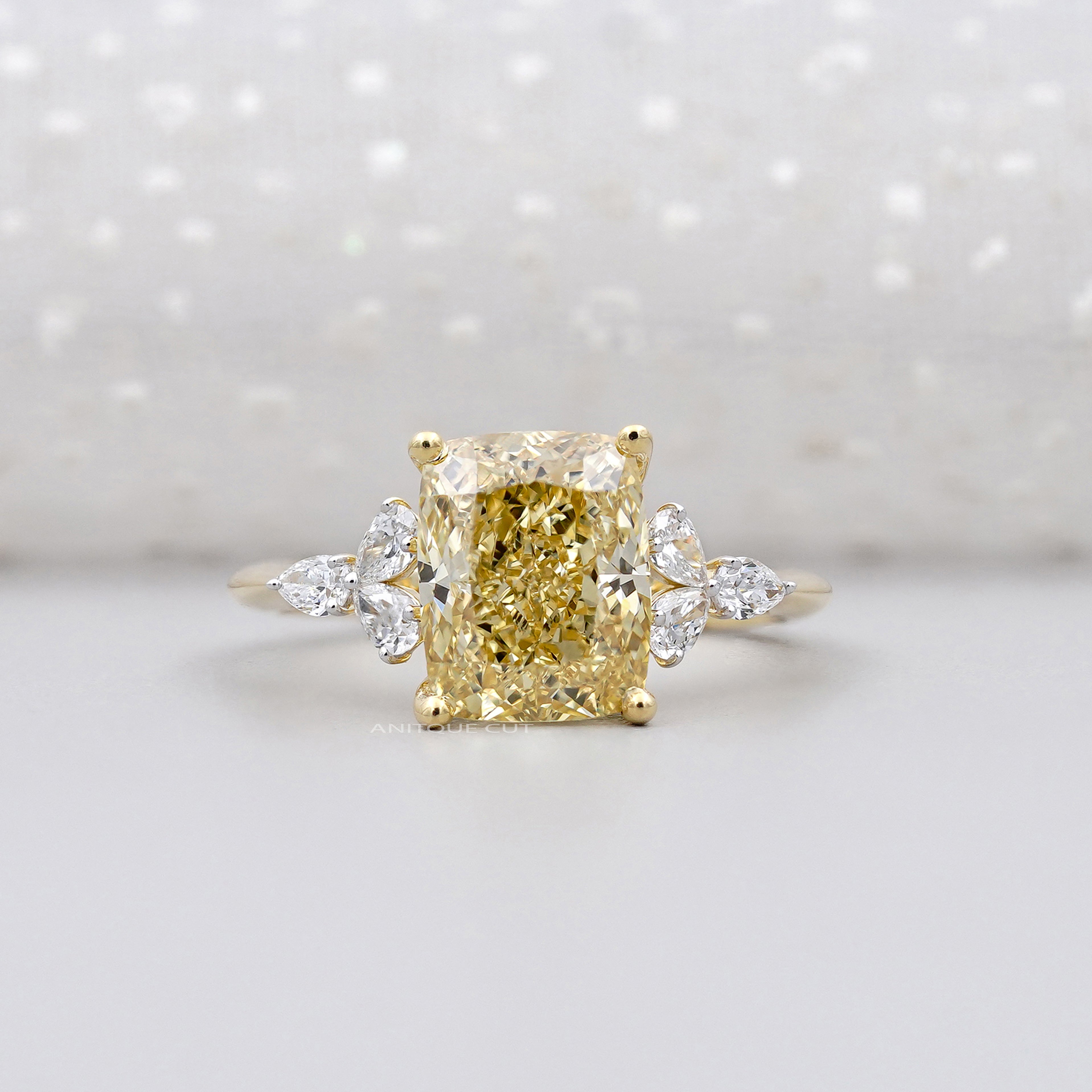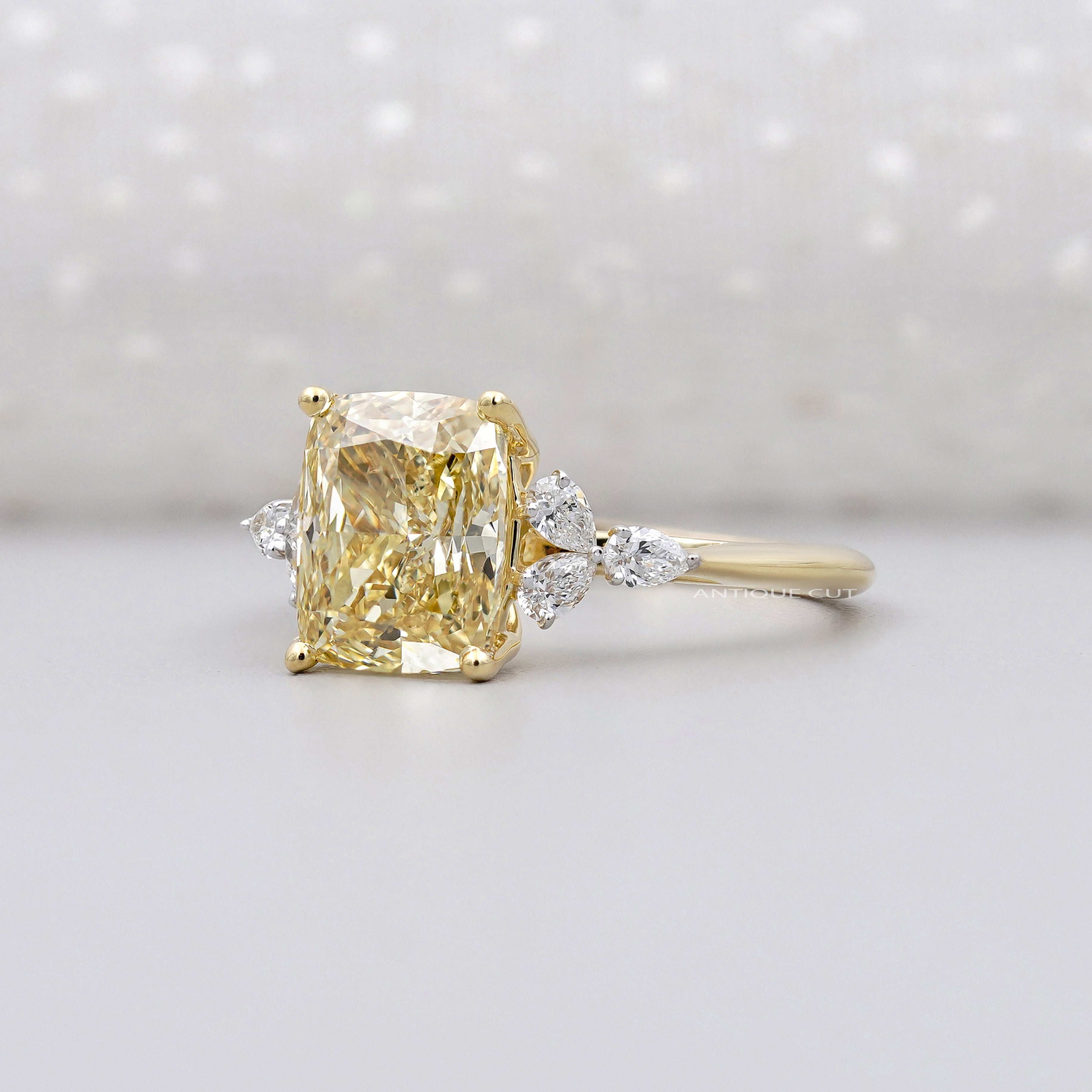 Make a bold and timeless statement with this luxury Fancy Yellow Diamond engagement ring, handcrafted to perfection. Featuring a 3.00 carat Cushion Cut Fancy Yellow diamond at the center, this ring radiates warmth, brilliance, and elegance. Delicately accented with 0.30ct pear-shaped white diamonds on each side, the design creates a romantic floral silhouette that enhances the center stone’s beauty.