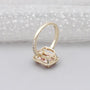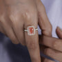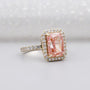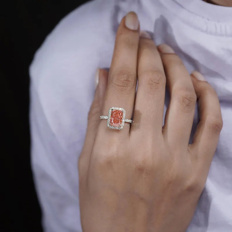 At the center is a breathtaking 3.00ct radiant-cut lab-grown diamond in a stunning pink hue, beautifully framed by a sparkling 0.36ct round diamond halo that enhances fire and presence from every angle.