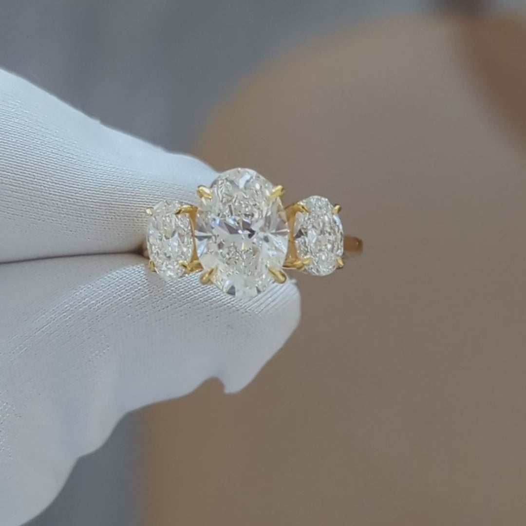 3.65tcw Oval Lab Diamond 3-Stone Engagement Ring | Hidden Halo | IGI Certified | Yellow Gold