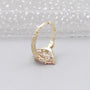 This ring centers a 3.00ct marquise fancy pink stone that shows a bright, warm color with clean sparkle. The elongated cut gives it a graceful look on the hand, while the vintage-inspired setting adds depth and character. Small white diamonds on each side total 0.15ct and sit in leaf-shaped details that frame the center stone in a natural way.