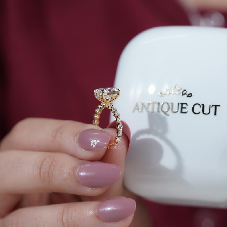 At the heart of the design is a stunning 3.00 carat oval-cut diamond, expertly set to maximize fire and brilliance. The center stone is beautifully complemented by 1.00 carat of round brilliant diamonds along the band and a delicate hidden halo beneath the center, adding a subtle yet luxurious sparkle from every angle with a total carat weight of 4.00 TCW.