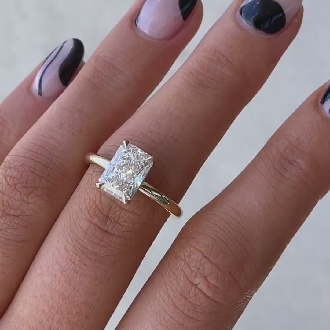 Make a bold statement with this 4.10tcw Radiant Cut Lab Grown Diamond Engagement Ring. Featuring a 4.00ct center stone and a hidden halo, it’s IGI certified and handcrafted in 10k/14k/18k gold. Ethical, elegant, and made to last a lifetime.