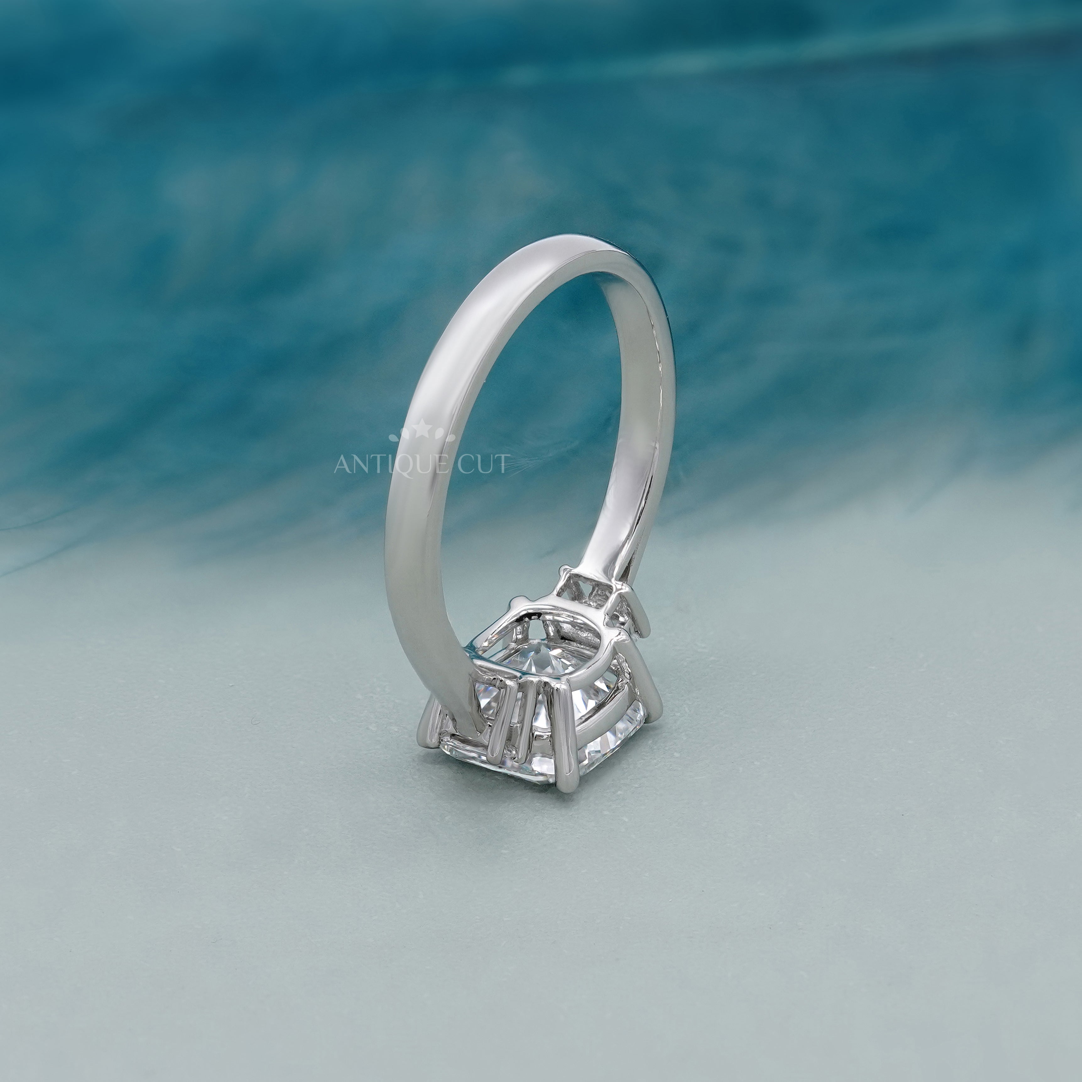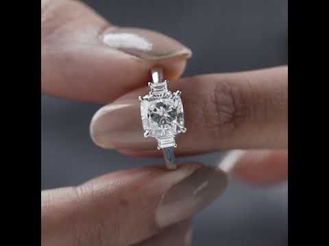 This exquisite 4.00ct cushion-cut diamond ring is a timeless three-stone design set in platinum or white gold. Flanked by two step-cut baguette side diamonds totaling 0.30ct, this ring embodies sophistication and balance. It’s an heirloom-worthy engagement ring that offers both brilliance and classic elegance.