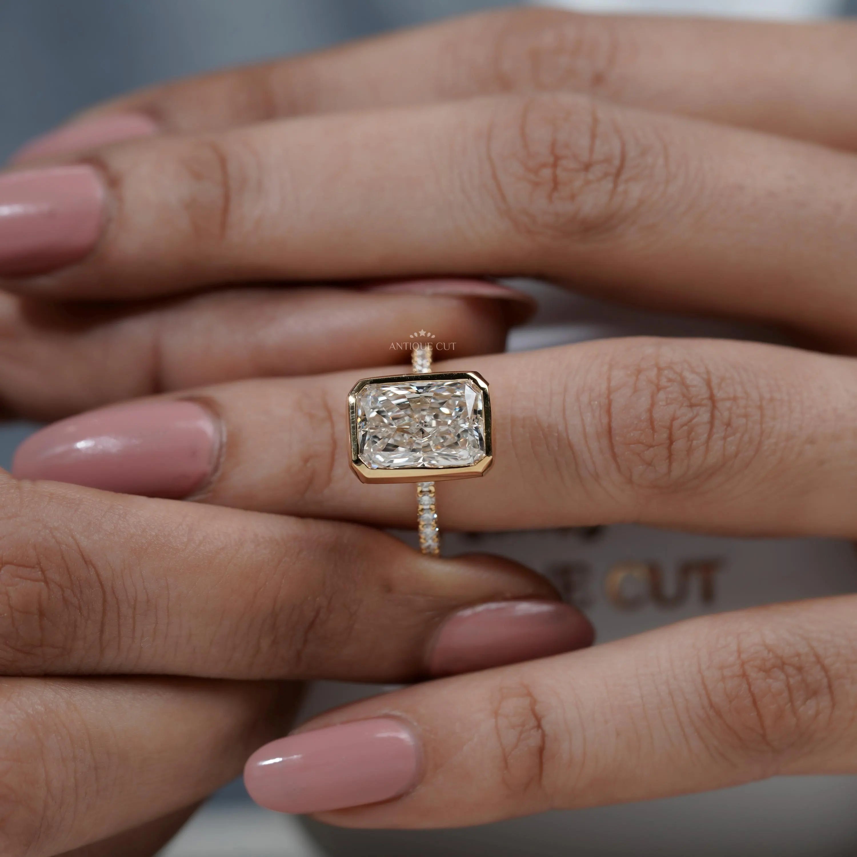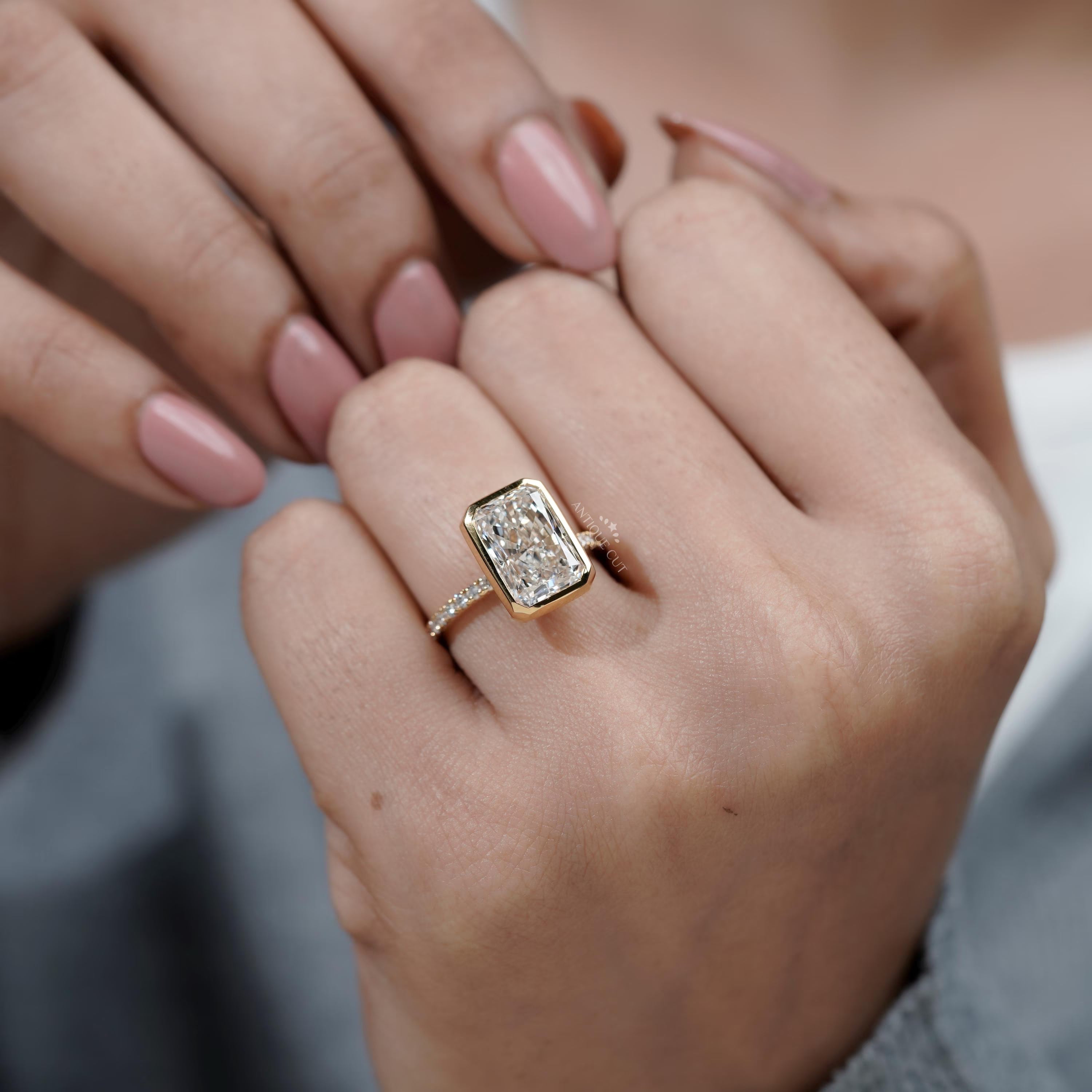 Make a statement that lasts a lifetime with this breathtaking Radiant Cut Diamond Engagement Ring, designed for those who appreciate bold brilliance with refined elegance. Featuring a striking 5.10 carat center stone secured in a sleek bezel setting, this ring offers a modern silhouette while providing excellent protection for the diamond. It is an exceptional choice whether you are exploring radiant cut diamond engagement rings for their fire and durability, or searching for a design that feels both contemporary and timeless.
