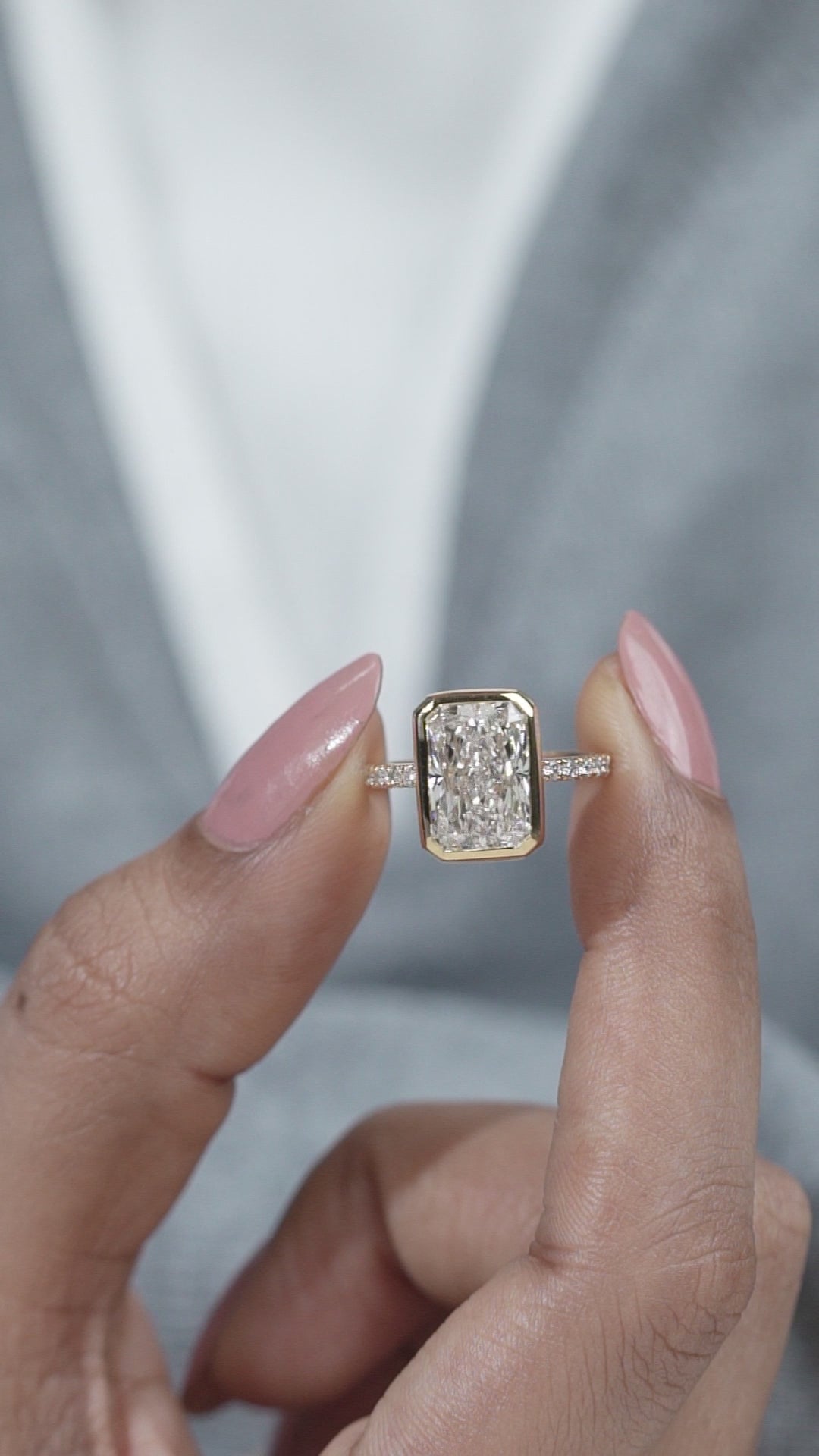 Celebrate your love with a ring that captures attention from every angle. This radiant cut bezel set engagement ring blends strength, sparkle, and sophistication, making it the perfect symbol of a confident and enduring commitment.