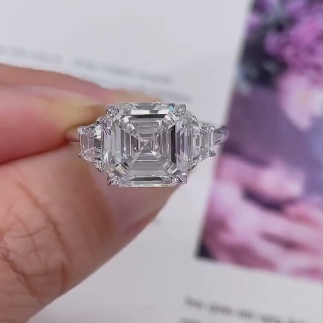 Asscher 5.40tcw Lab Diamond Ring | Trapezoid Side Stones | Three Stone | IGI Certified