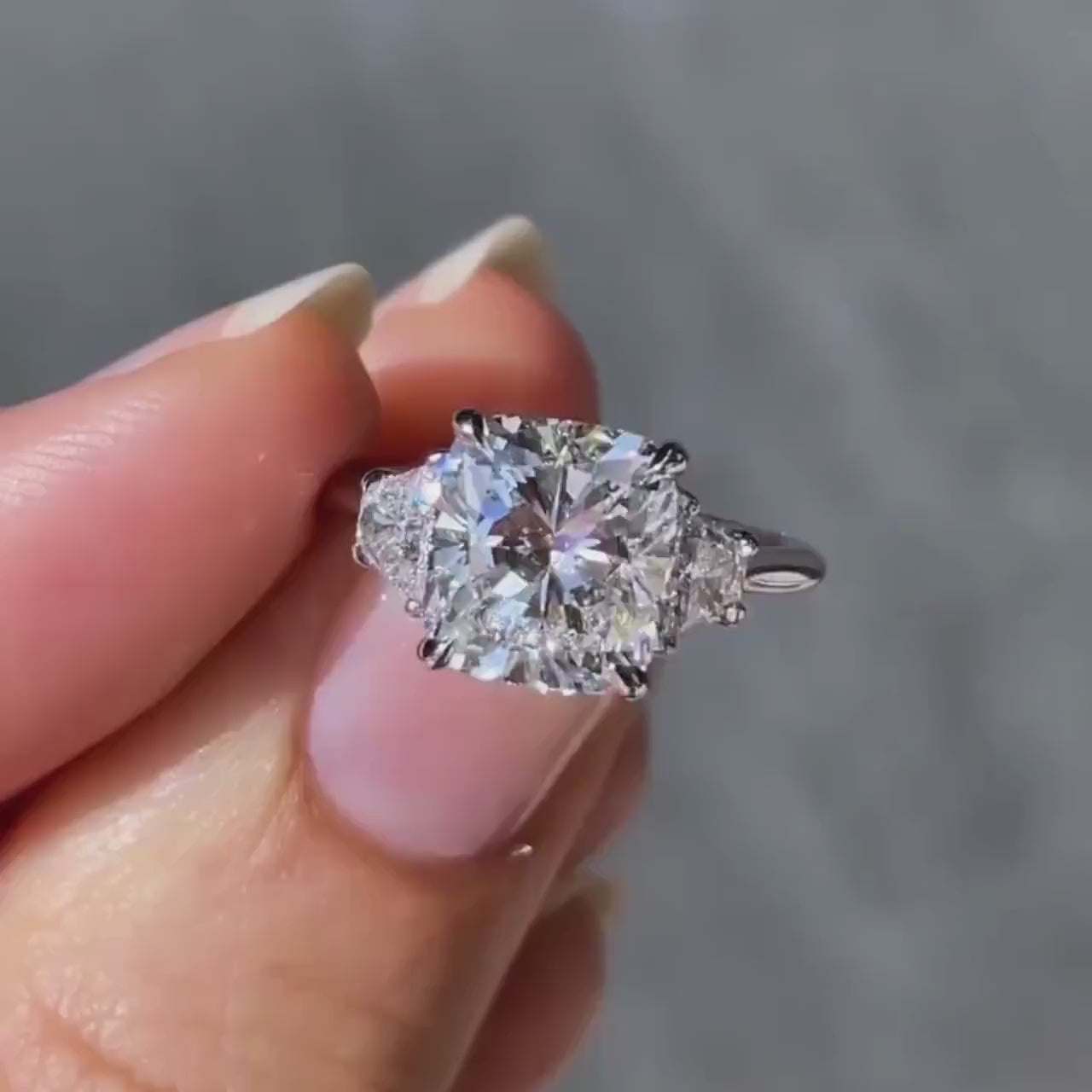 3.00tcw Cushion Lab Diamond Three Stone Ring | IGI Certified | D-E-F | VVS–VS | Trapezoid Side Stones