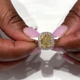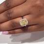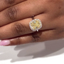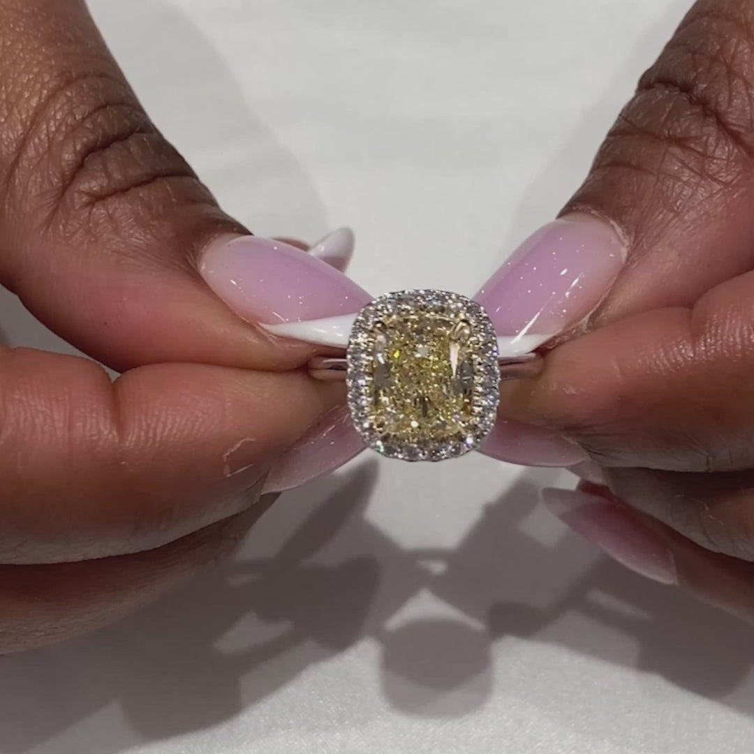 • 3.00ct bold fancy yellow cushion center + 0.30ct halo brilliance