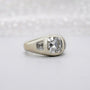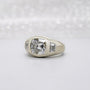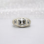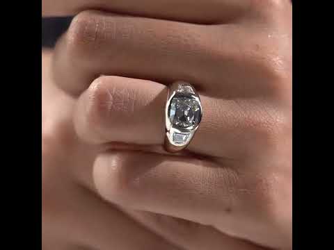 Featuring a 3.00ct cushion-cut center framed by 0.70ct trapezoid or tapered baguette side stones, this signet-style design balances masculinity with brilliance.