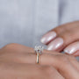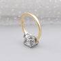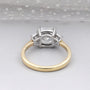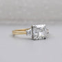 This handcrafted three-stone engagement ring features a bright 2.70ct cushion-cut lab-grown diamond paired with 0.40ct of tapered baguettes, bringing the total to 3.10tcw. The center stone shows strong fire and depth, while the baguette sides add a clean, elegant finish. Set in a two-tone gold design, it blends modern details with timeless style.