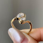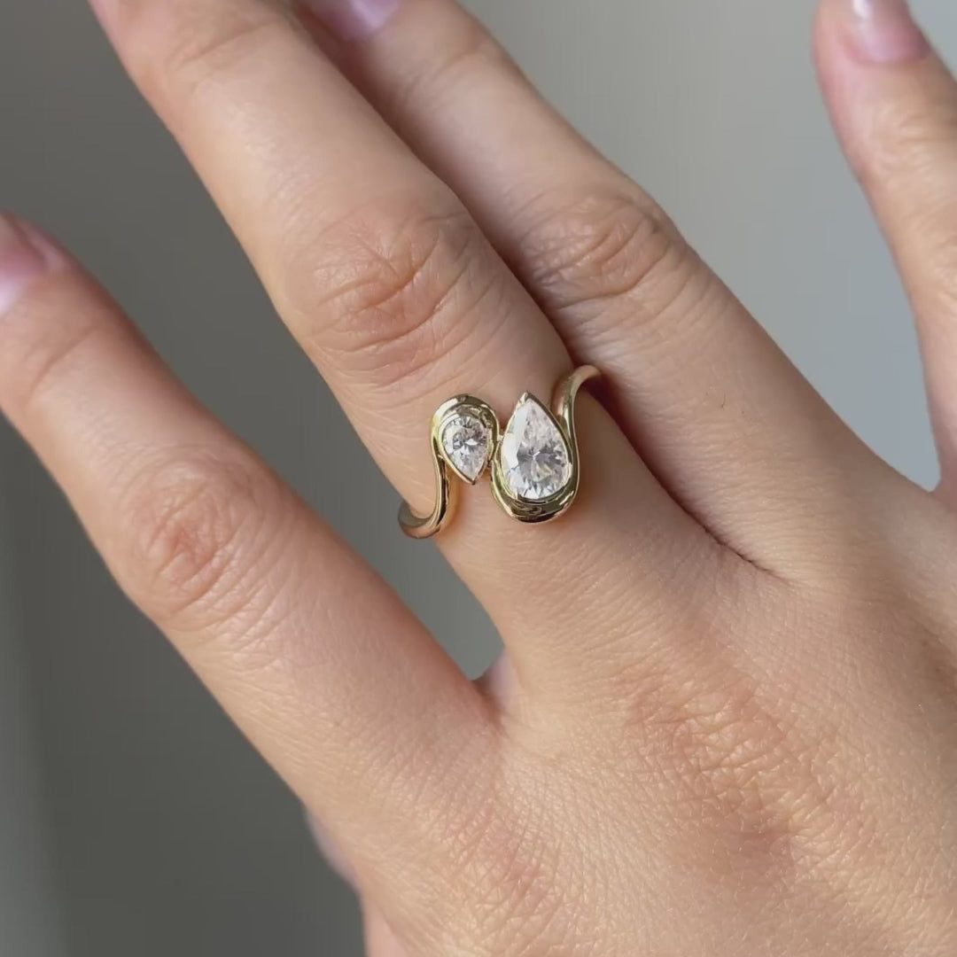 Elegant 1.50tcw Double Pear Lab-Grown Diamond Engagement Ring in 10k/14k/18k gold. Features 1.00ct + 0.50ct DEF color, VVS–VS clarity stones. IGI certified. Eco-friendly, handcrafted, and customizable.