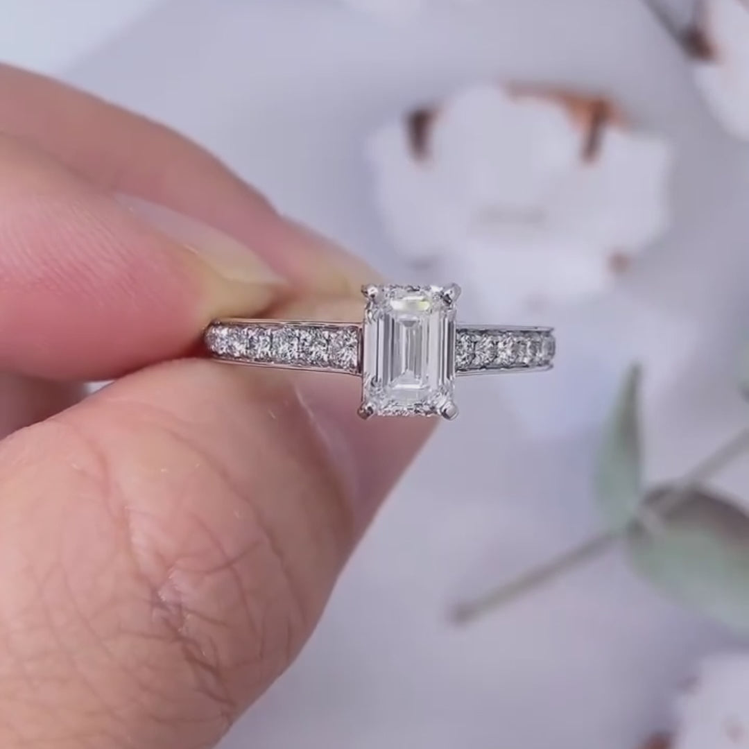This 1.50tcw Emerald Cut Lab Grown Diamond Engagement Ring features a 1.00ct center stone with 0.50ct of round side diamonds in a sleek channel setting. Set in 10k, 14k, or 18k white gold, this IGI-certified ring is an elegant and ethical choice for modern love.