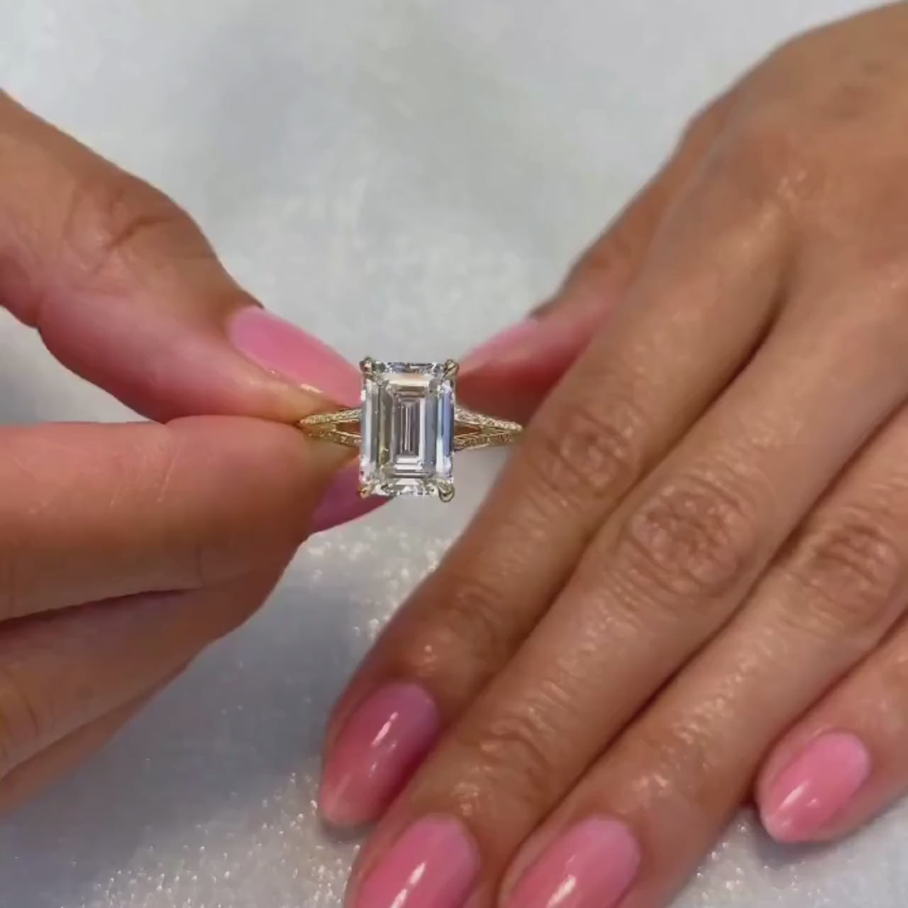 This 3.50tcw Emerald Cut Lab Grown Diamond Engagement Ring features a bold 3.00ct center stone and 0.50ct round pavé diamonds. Set in elegant rose gold with a modern knife-edge split band, this IGI-certified ring offers brilliance with ethical beauty.