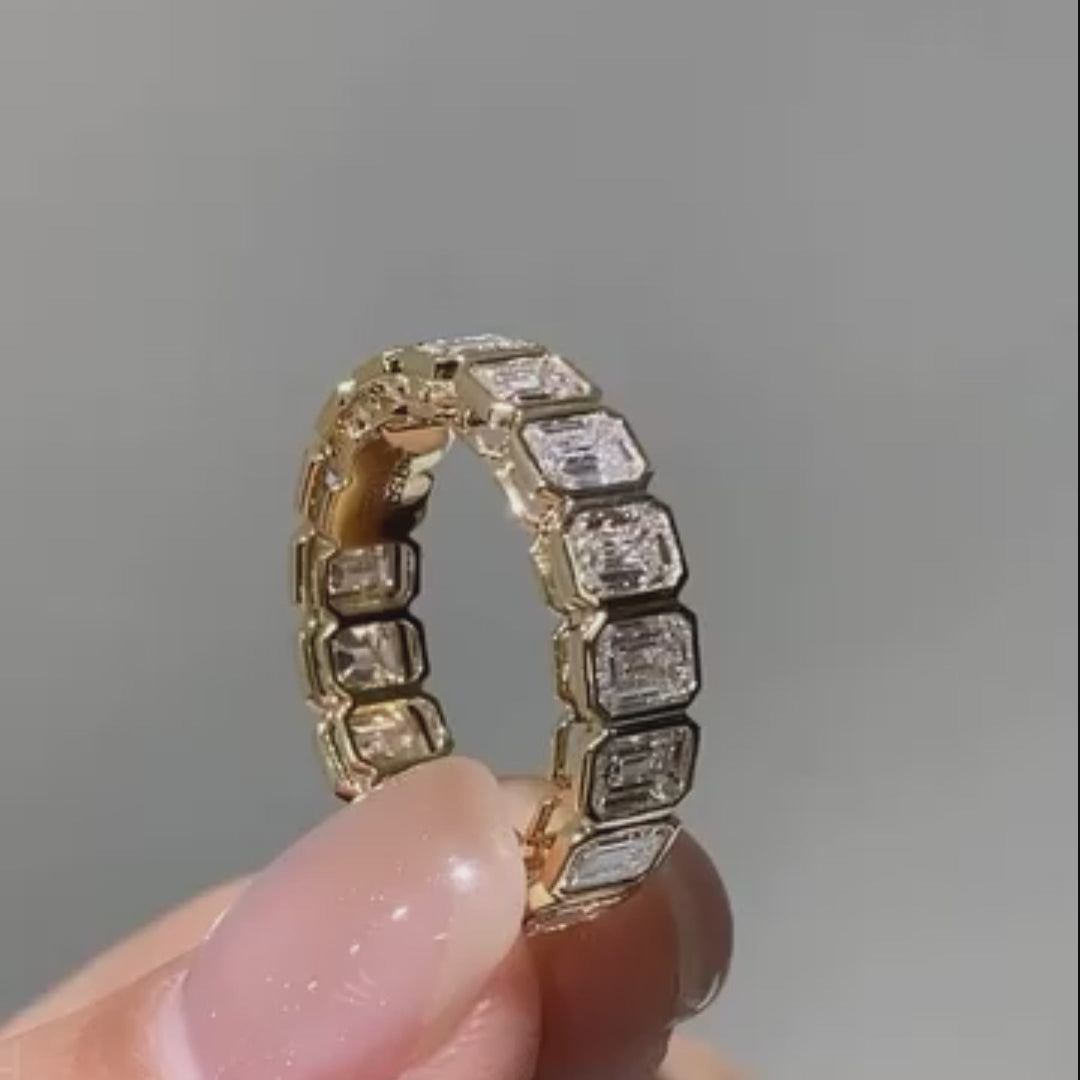 Make your forever moment shine with this 3.60tcw Emerald Cut Lab Grown Diamond Eternity Ring. Featuring a sleek bezel setting, this elegant band showcases premium DEF color, VVS–VS clarity diamonds, ensuring brilliant sparkle, timeless style, and a clean conscience.