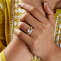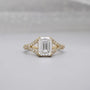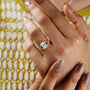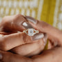 Crafted in 10k, 14k, or 18k yellow gold, this design enhances the stone’s linear beauty while adding just the right amount of sparkle with its hand-set round diamonds along the band. Graded D–E–F color and VVS–VS clarity, this IGI-certified diamond ring is an ethical, sustainable alternative to mined diamonds—perfect for the modern bride who values beauty with purpose.