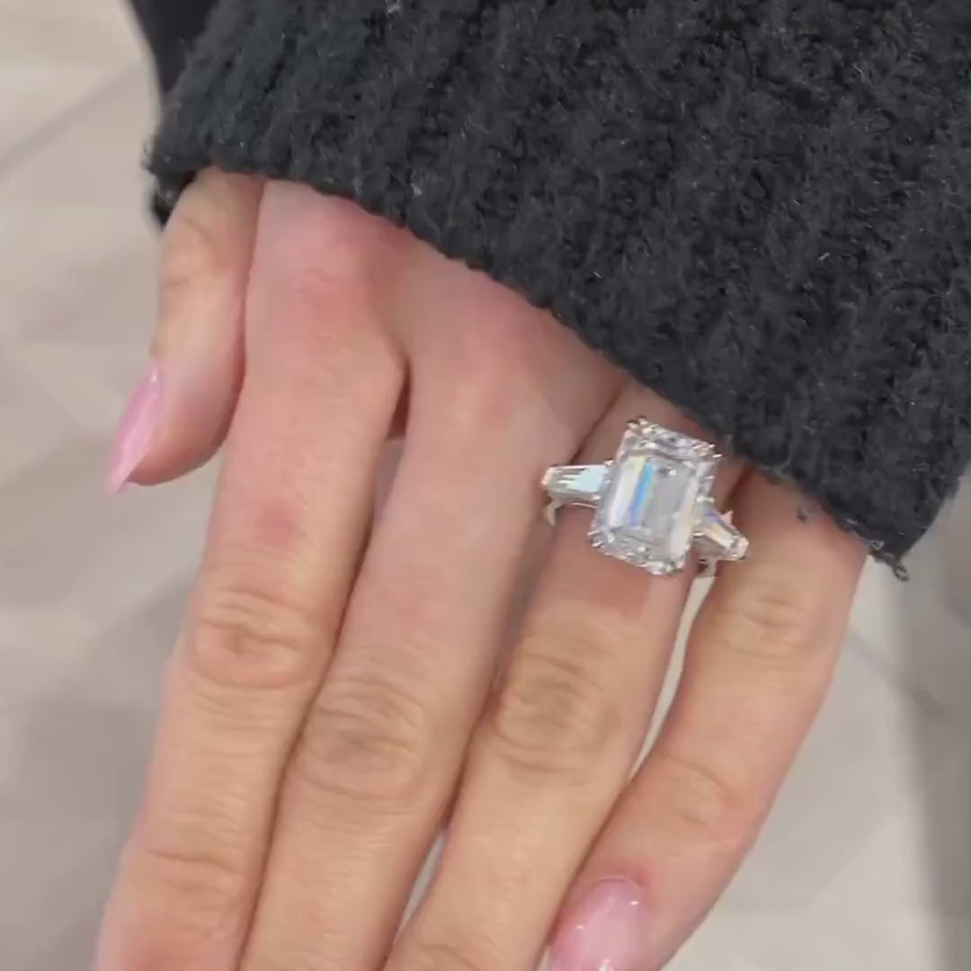 Emerald 7.00tcw Lab Diamond Three Stone Ring | IGI Certified | Tap Baguette | D-E-F VVS–VS Clarity