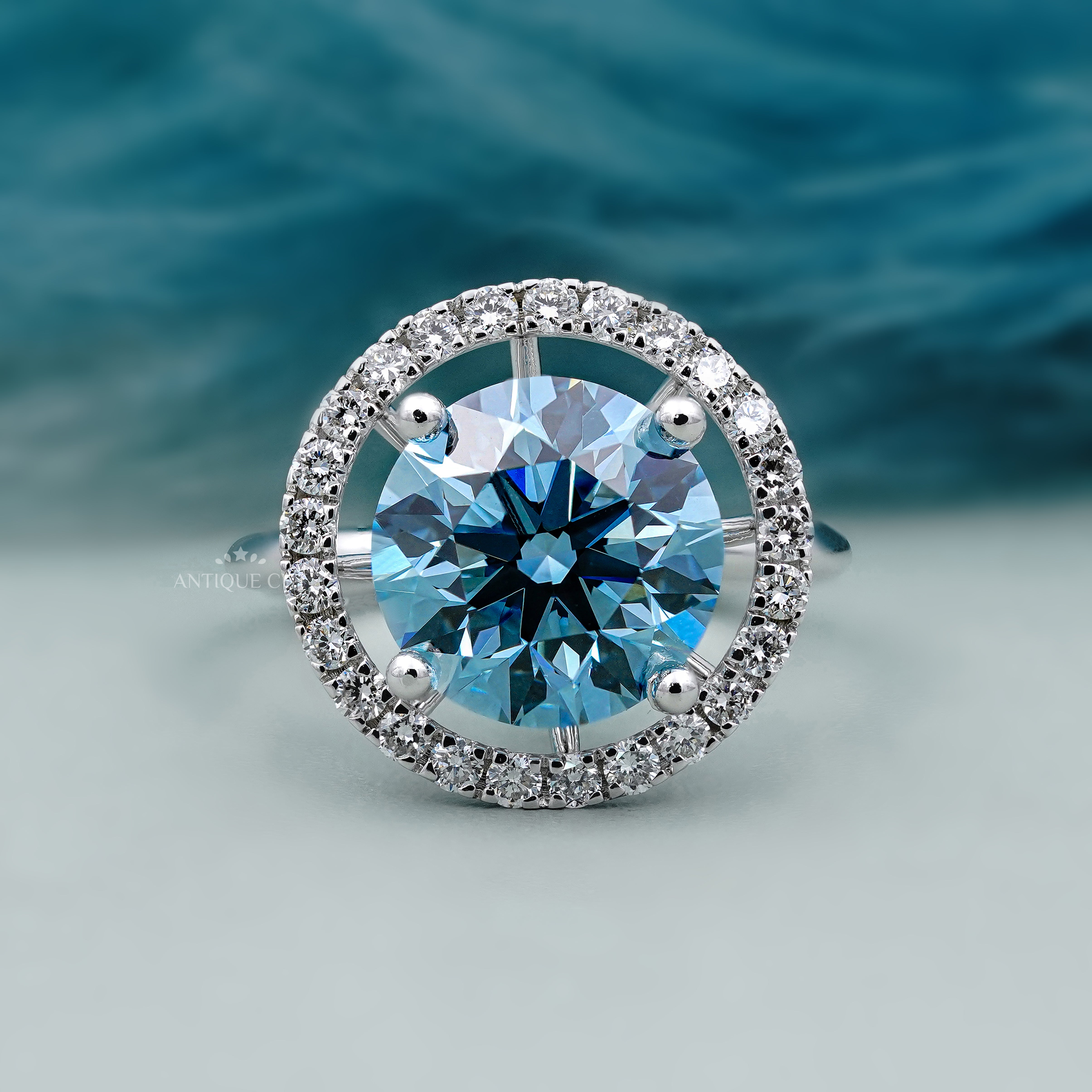 Fancy Blue Diamond Ring | Round Halo Engagement Ring With 4 Prong Setting | IGI Certified