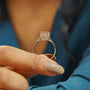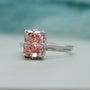 Turn heads with this exquisite 3.40tcw Radiant Fancy Pink Lab Grown Diamond Engagement Ring, set in a majestic cathedral-style solitaire. The radiant-cut diamond is held securely by an elegant 8-claw crown setting, surrounded by a glittering halo of micro-pavé accents and intricate under-gallery detailing.
