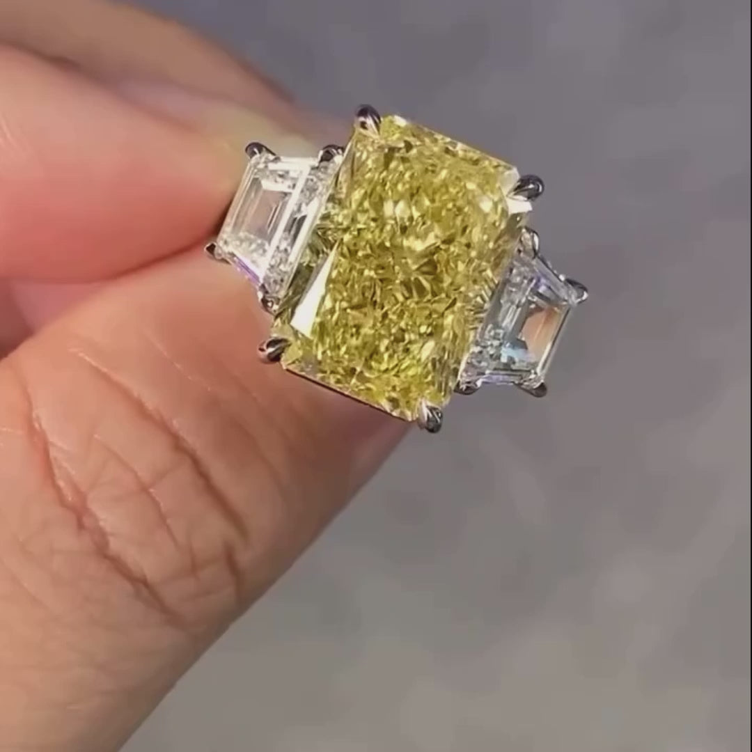 Make a bold and unforgettable statement with this 12.50 Total carat weight lab-grown diamond ring. The centerpiece features a 10.00 carat Fancy Yellow Radiant Cut diamond, glowing with unmatched brilliance. Flanked by 2.50-carat D-E-F color Trapezoid Cut side diamonds, this three-stone design radiates modern luxury and classic charm.