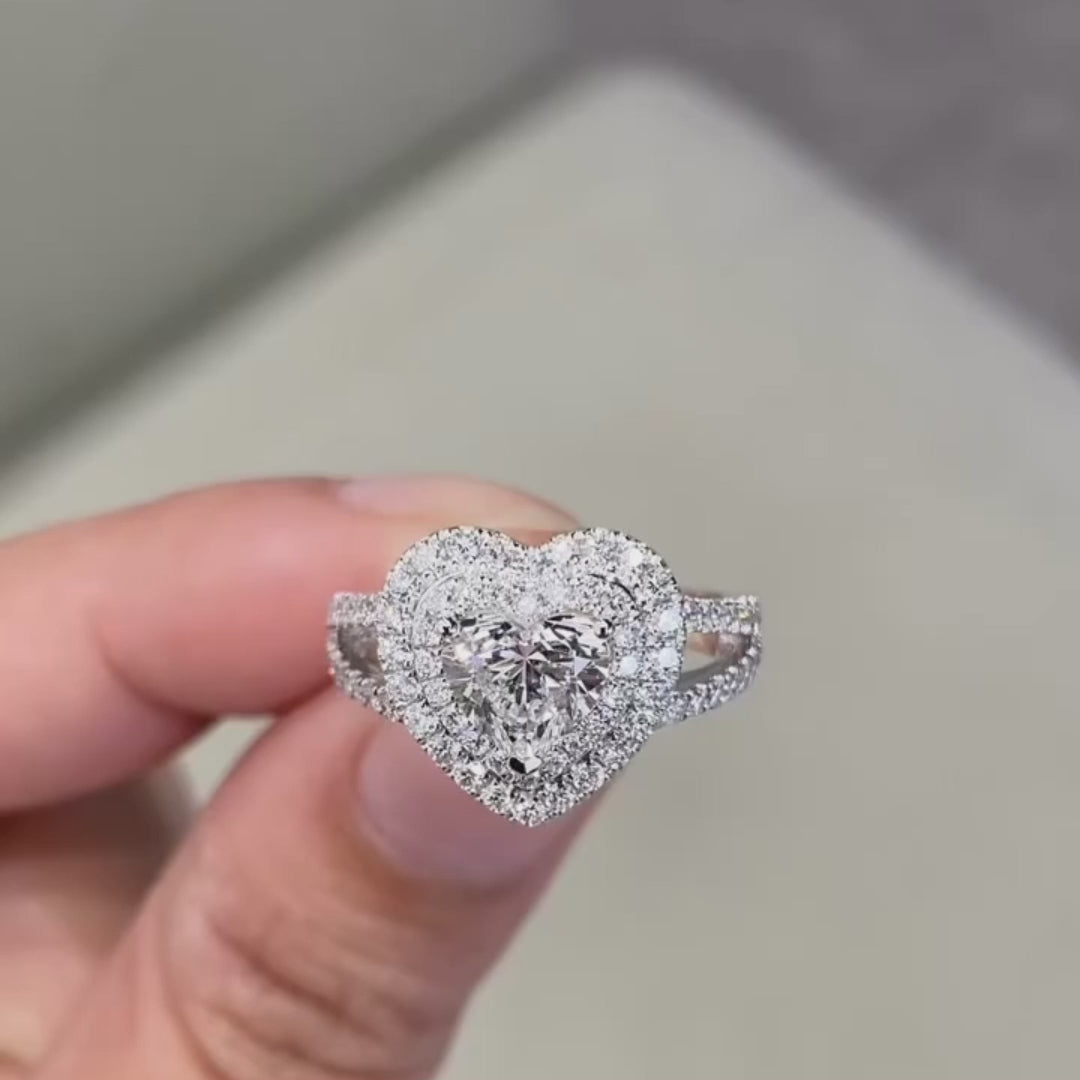 This 1.80tcw heart-shaped lab-grown diamond engagement ring features a 1.00ct heart center, surrounded by 0.80ct round side stones in a dazzling double halo and split shank pavé band. IGI certified, D-E-F color, VVS–VS clarity — a romantic, customizable choice in gold or platinum for an unforgettable statement.