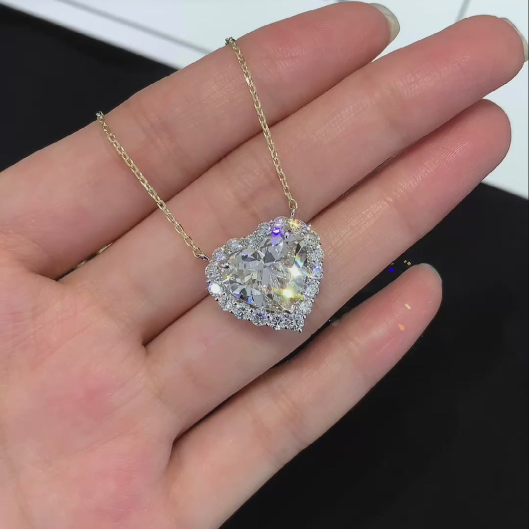 Celebrate your love with this elegant 6.80tcw Heart Lab-Grown Diamond Halo Style Solitaire Pendant Necklace. Showcasing a flawless Heart-shaped EF and VS diamond set in 10k/14k/18k gold, this necklace is an ethical and dazzling choice. Crafted with precision and adorned with 𝐈𝐆𝐈-𝐜𝐞𝐫𝐭𝐢𝐟𝐢𝐞𝐝 diamonds, it embodies timeless beauty and eco-conscious luxury, perfect for any special occasion.