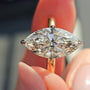 This 3.20tcw marquise lab-grown diamond ring features a 3.00ct center stone with a hidden halo. IGI certified, D–F color, VVS–VS clarity, and handcrafted in two-tone gold—yellow band with white prongs for a modern touch. Ethical elegance at its finest.
