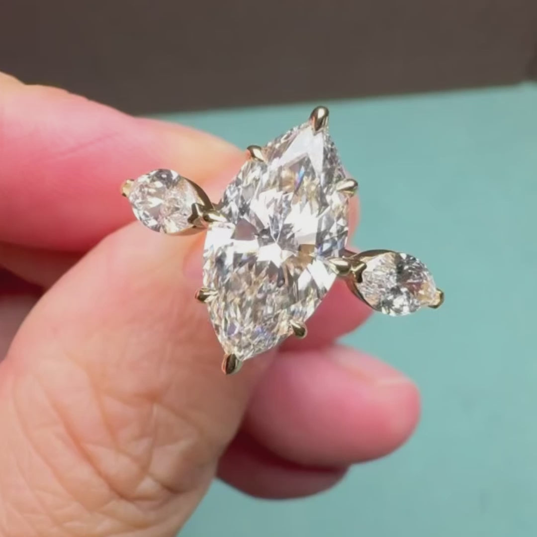 Marquise 3.60tcw Lab Grown Diamond Ring | 3.00ct Center + 0.60ct Marquise Side Stones | IGI Certified | Yellow Gold Three Stone Ring