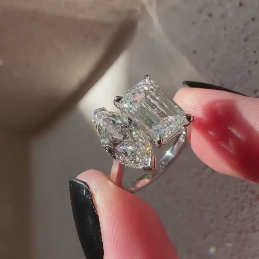 This 5.00tcw lab-grown diamond Toi Et Moi ring pairs a 2.00ct marquise and 3.00ct emerald-cut diamond. IGI-certified and customizable in 10k, 14k, or 18k white, yellow, or rose gold. Ethically handmade for your most meaningful moments.