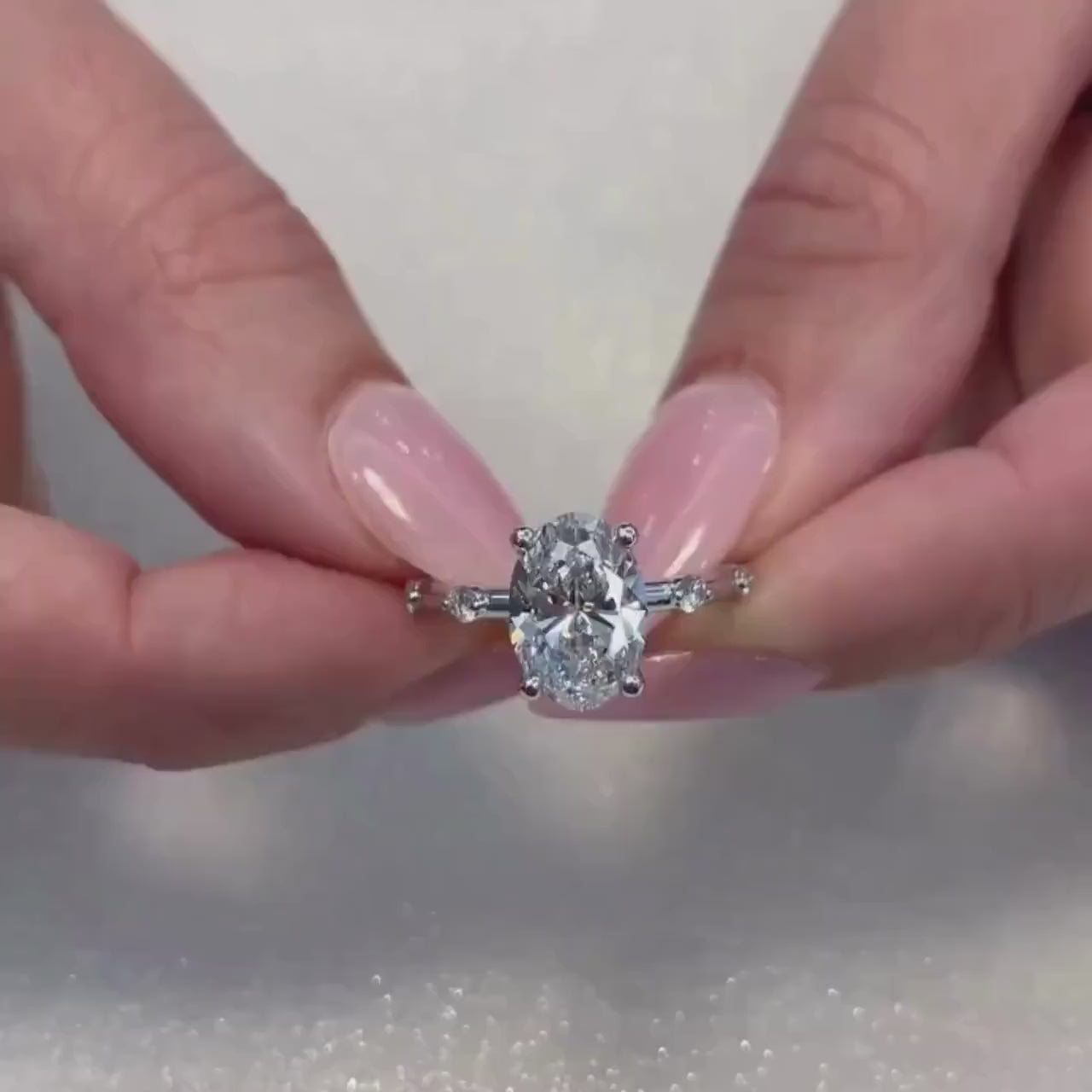 This 2.50ct oval lab-grown diamond ring features a 2.20ct center stone with 0.30ct pavé side diamonds. IGI certified and handcrafted in white or rose gold — a timeless, eco-conscious engagement ring for the modern bride.