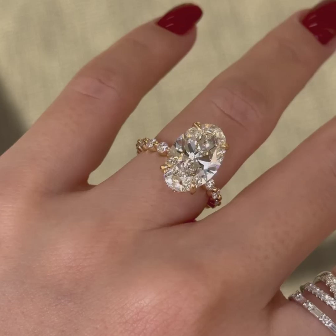• Striking 2.50ct oval center with 0.80ct pavé and hidden halo accents