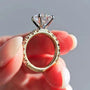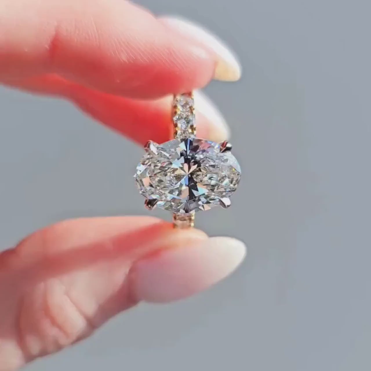 This 4.50tcw Oval Lab-Grown Diamond Ring features a 4.00ct center and 0.50ct pavé side stones. Crafted in two-tone yellow gold with white prongs and IGI-certified DEF/VVS–VS diamonds, it offers timeless brilliance, ethical elegance, and handcrafted perfection.