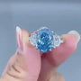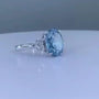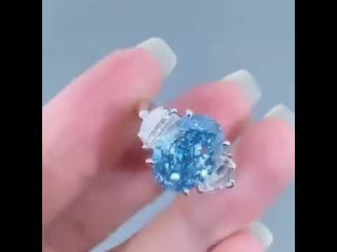 Features a 3.50ct blue oval center with 1.50ct trapezoid-cut side diamonds, all in VVS–VS clarity.