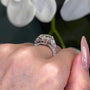 ● Design – Elegant three-stone layout with halo detailing for brilliance