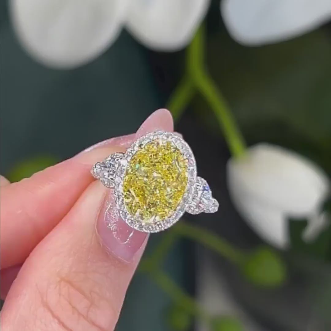 Celebrate your love with this 7.40tcw Oval Fancy Yellow lab-grown diamond ring. Features a 5.50ct center with pear and round side stones in a halo three-stone setting. IGI certified, eco-friendly, and crafted in 10k/14k/18k white gold. Perfect for a timeless statement.