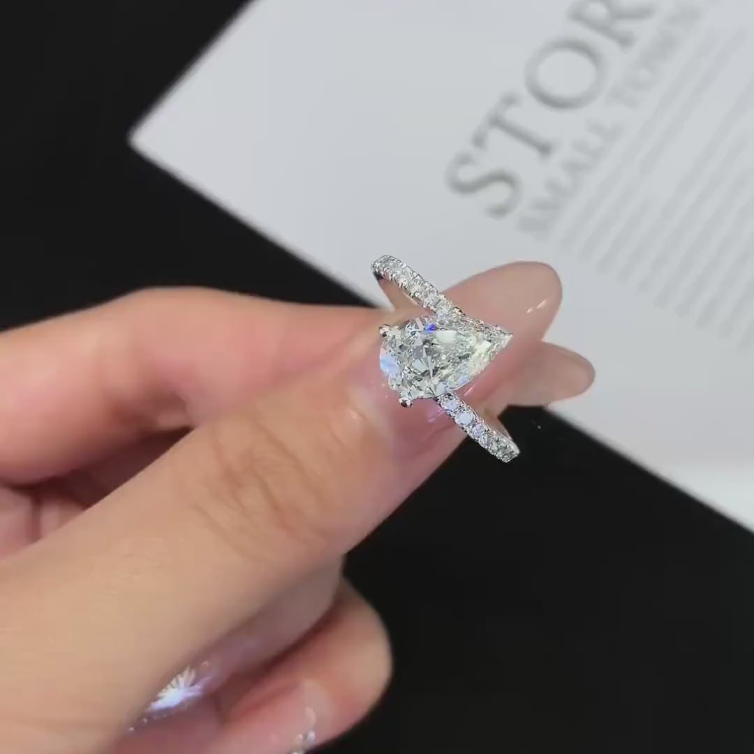 • Diamond: 1.60ct Pear center with 0.40ct round side stones, DEF color, VVS–VS clarity