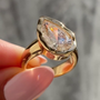 • Features a bold 5.00ct pear-cut center in a sleek bezel design