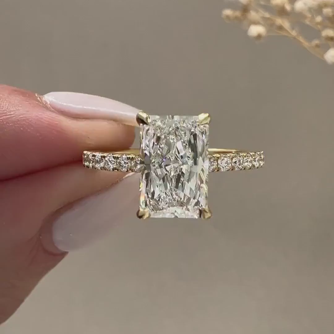 This 2.40tcw Radiant Lab-Grown Diamond Ring features a 2.00ct radiant center with a hidden halo and 0.40ct side stones. Set in yellow gold, IGI certified, and crafted with DEF color, VVS–VS clarity—perfect for timeless elegance and ethical luxury.
