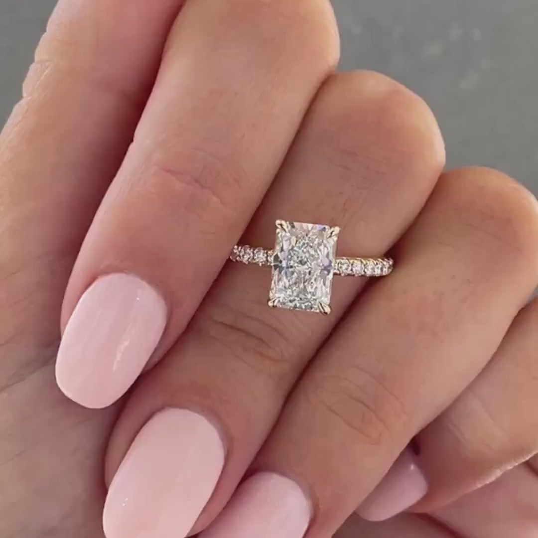 Radiant Cut 3.30tcw Lab Diamond Ring | IGI Certified | Hidden Halo & Yellow Gold Pave Band